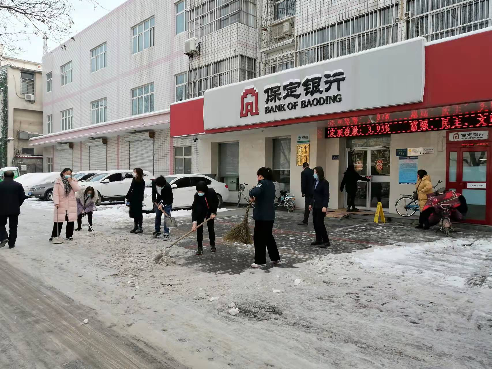 2月12日至13日,保定市普降中到大雪,截止13日20时,全市累计平均降雪量达7.1毫米,主城区降雪量达8.7毫米。保定银行建设路支行、徐水支行、双彩支行、安国支行、博野支行、大西门支行、花园里支行、建华路支行、满城支行、清苑支行、易县支行、长城支行等多家支行秉承保定银行服务市民百姓理念,在降雪过后第一时间组织开展支行门前及周边区域铲冰除雪工作,清除道路积雪,并铺设防滑垫、设置防滑、通行标识,及时消除安全隐患,保障顾客及市民出行安全。