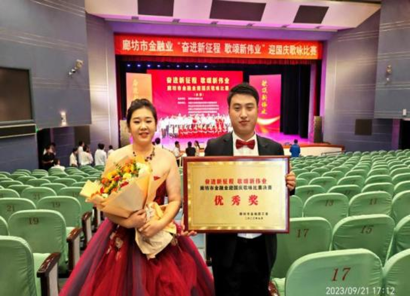 保定银行廊坊分行积极组队参加,分行特选两位员工进行对唱,初赛参赛曲目为《不忘初心》,复赛参赛曲目为《灯火里的中国》。二人在比赛中以饱满的精神状态、娴熟的歌唱技巧和嘹亮的歌声展现了保定银行人团结奋进、昂扬向上的精神风貌,赢得了在场领导、全体评委和现场观众的一致好评,最终荣获优秀奖,为庆祝中华人民共和国成立74周年献上了一份诚挚的祝福。