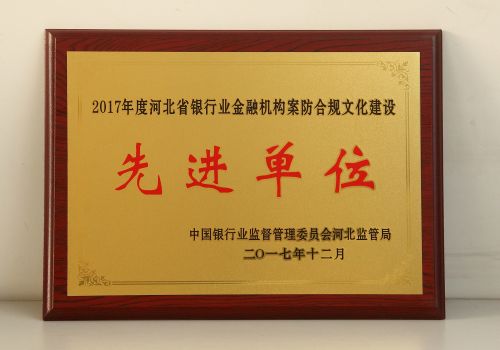 2017年12月13日,河北省银监局在石家庄市召开2017年度河北省银行业金融机构案防合规文化建设先进单位经验交流会议。会议公布了“河北省银行业金融机构案防合规文化建设先进单位”获奖名单,共有74家银行业金融机构受列表彰。保定银行总行、保定银行石家庄分行、保定银行定州支行位列其中,获得“2017年度河北省银行业金融机构案防合规文化建设先进单位”荣誉称号 。
