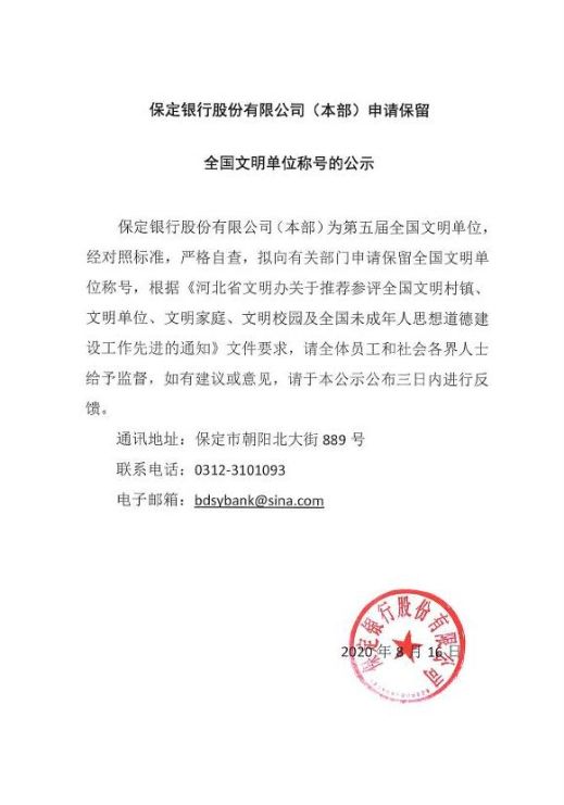 保定银行股份有限公司(本部)申请保留全国文明单位称号的公示