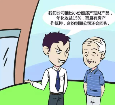 犯罪分子往往宣称 " 无门槛或低门槛,低风险,高回报,期限灵活 " 等,销售所谓理财产品,承诺有房产或车辆作为抵押,向社会公众吸取资金,用于对外投资经营等,一旦投资失败,投资者的钱就无法收回。事实上,所谓房产、车辆抵押可能只是个骗局。