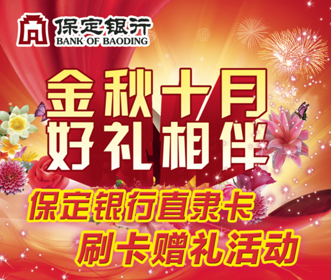 金秋豪礼,欢度十一。国庆节期间保定银行在保百购物广场、保定百货大楼、保百购物家园、保百欣和超市、北国先天下、北国商城、保定商场几大卖场开展保定银行直隶卡刷卡赠礼活动,刷卡消费满指定金额可获赠升级豪礼,数量有限,先到先得,详情见各大卖场宣传海报,精彩活动期待您的参与。