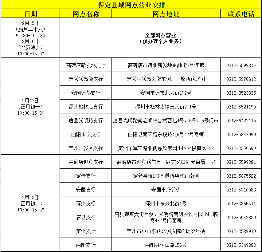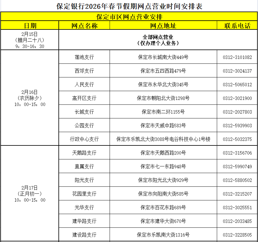 保定银行关于2026年春节期间网点营业时间安排的公告