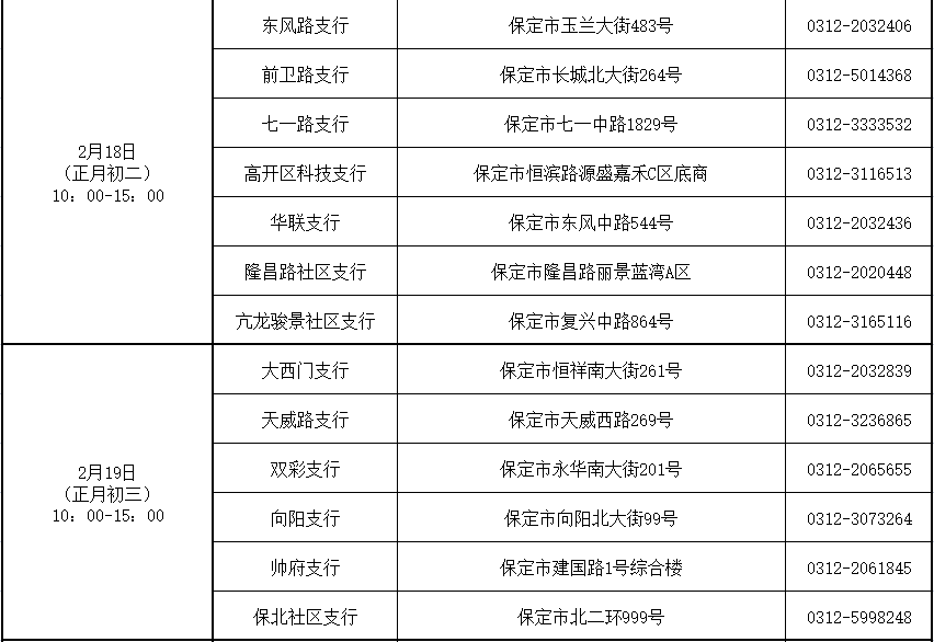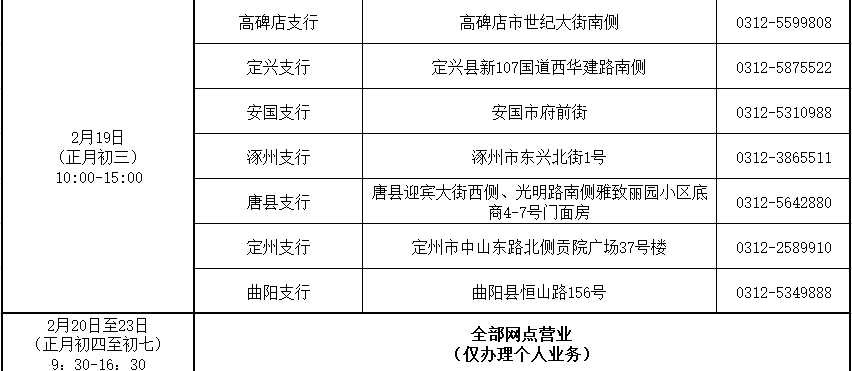 您好,感谢您长期以来对保定银行的信任与支持!根据《国务院办公厅关于2026年部分节假日安排的通知》精神,结合我行实际情况,现将2026年春节期间网点营业时间安排公告如下: