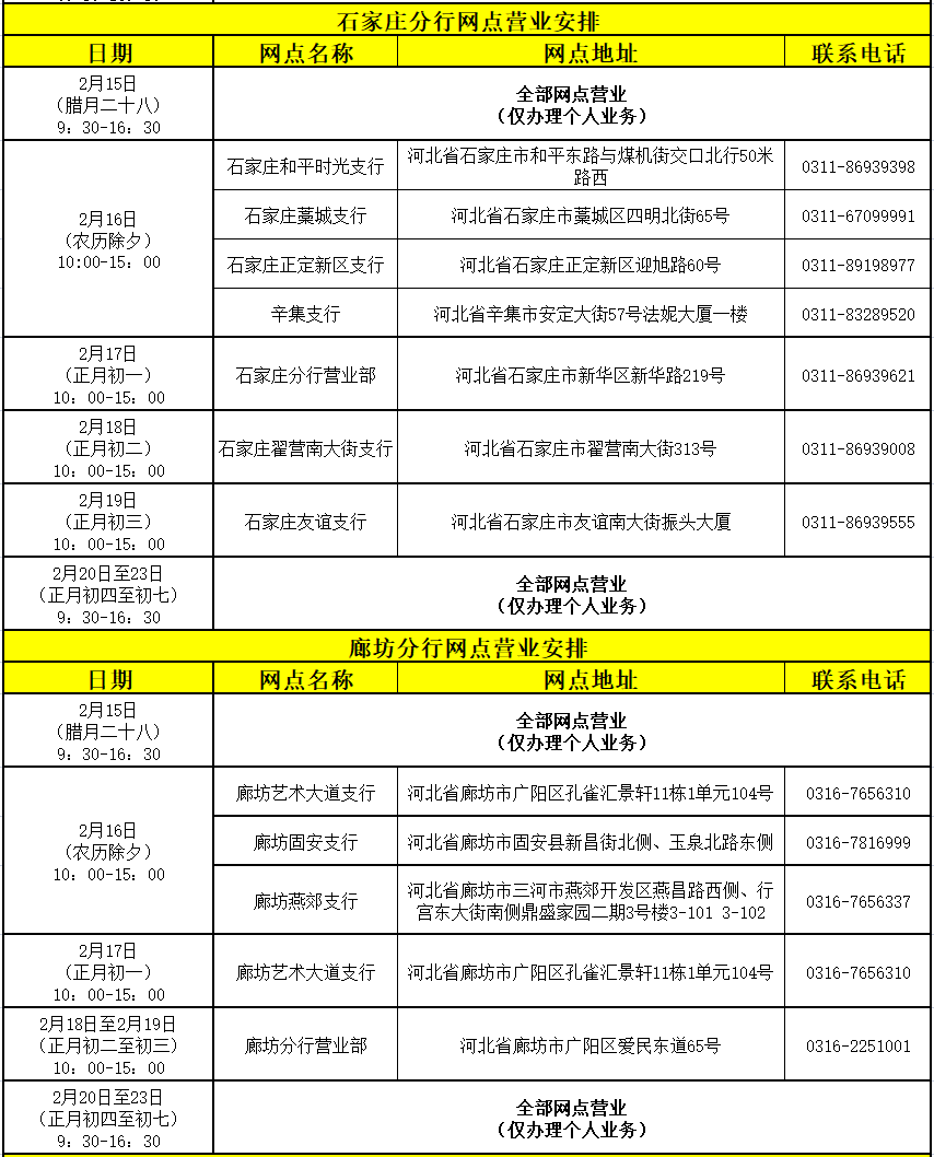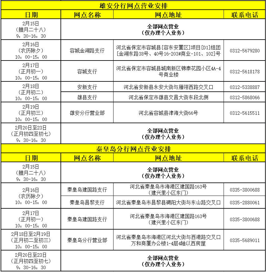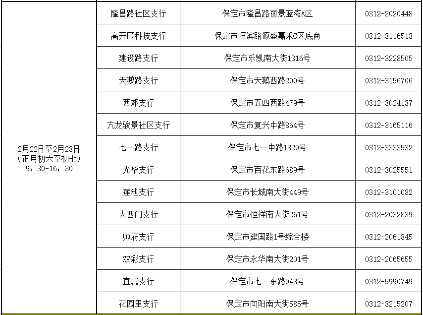 2月15日至2月23日,全行营业网点实行弹性轮休(具体营业网点安排见附表),营业时间调整如下: