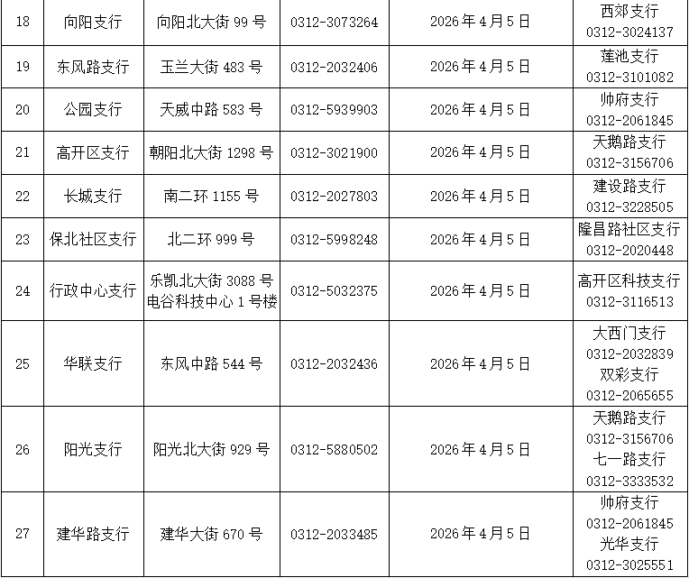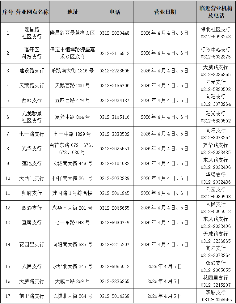 2026年4月4日至4月6日,保定市区营业网点实行弹性轮休(具体营业网点详见附表),法定节假日期间营业时间统一调整为9:30至16:30。